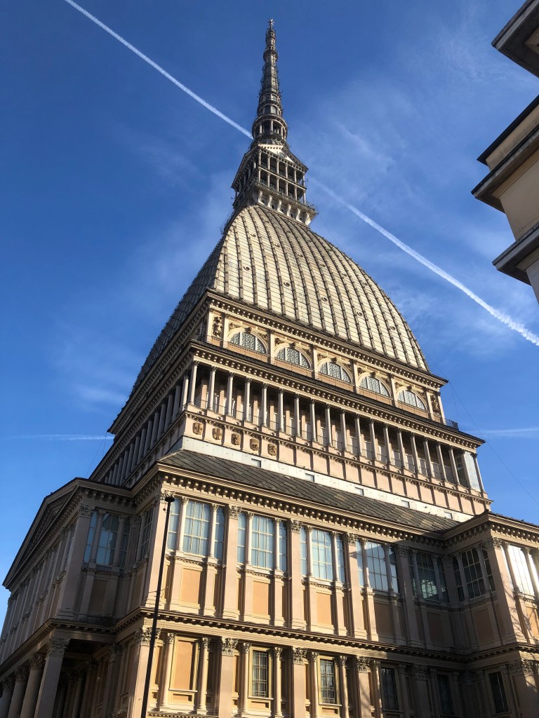 Infatti, appena parcheggiata l’auto a due passi dal simbolo di Torino, la fila di gente che aspetta pazientemente di salire in cima alla Mole Antonelliana, ci fa capire subito che non abbiamo scelta. Ci fermiamo qualche minuto ad ammirare l’architettura di ciò che, al momento del suo completamento, nel 1889, e fino al 1908, con i suoi 167,5 metri di altezza, è stata la costruzione in muratura più alta del mondo.