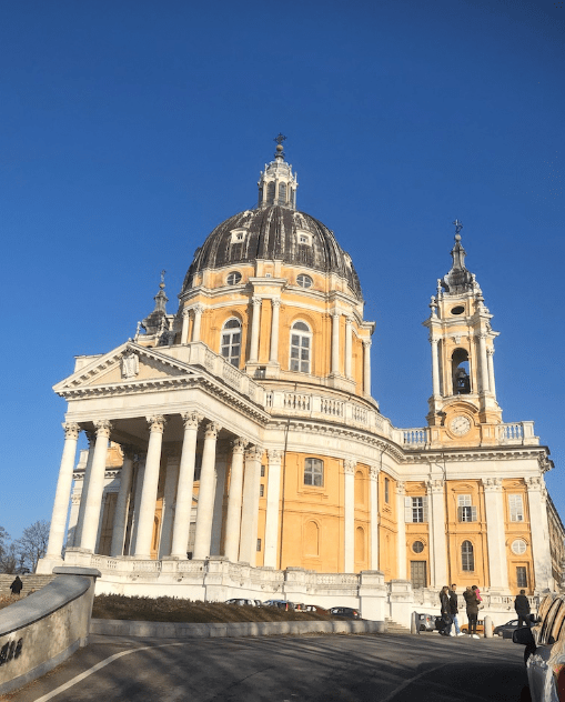 Il giallo della basilica, costruita tra il 1717 ed il 1737, risalta moltissimo contro il cielo blu senza nemmeno una nuvola di questo pomeriggio di gennaio. La storia ci racconta che, il 2 settembre 1706, il Duca Vittorio Amedeo II di Savoia sali in cima alla collina per osservare la disposizione del campo di battaglia attorno alla città. A quel tempo Torino era assediata dalle truppe francesi di Luigi XIV e il Duca, pregando nella chiesetta allora presente, fece voto a Dio che, se gli avesse fatto ottenere la vittoria sull’esercito francese, avrebbe fatto erigere una grande chiesa in suo onore. Cinque giorni più tardi si svolse la cruenta battaglia. L’esercito piemontese sconfisse quello del Re francese ed il Duca, onorando la promessa fatta, ordinò che venisse progettata e costruita una grade basilica.