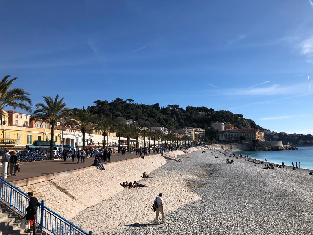 Usciti da Ville Massena, ci avviamo a piedi verso il mare, prendendo Rue de Rivoli, al termine della quale raggiungiamo l’Hotel Le Negresco, la cui cupola è un vero e proprio punto di riferimento della città. Attraversiamo la Promenade des Anglais e ci avviamo a piedi lungo la passeggiata che costeggia il mare, in direzione della collina del castello. Giunti davanti al Palais de la Méditerranée, decidiamo di fare una veloce giocata ad una slot machine del casinò al suo interno. La fortuna non ci sorride, perciò riprendiamo il nostro cammino. Arrivati alla Plage des Plonchettes azzardiamo a mettere i piedi nel mare. Nonostante la splendida giornata l’acqua è ancora piuttosto fredda, ma la sensazione è comunque piacevole.