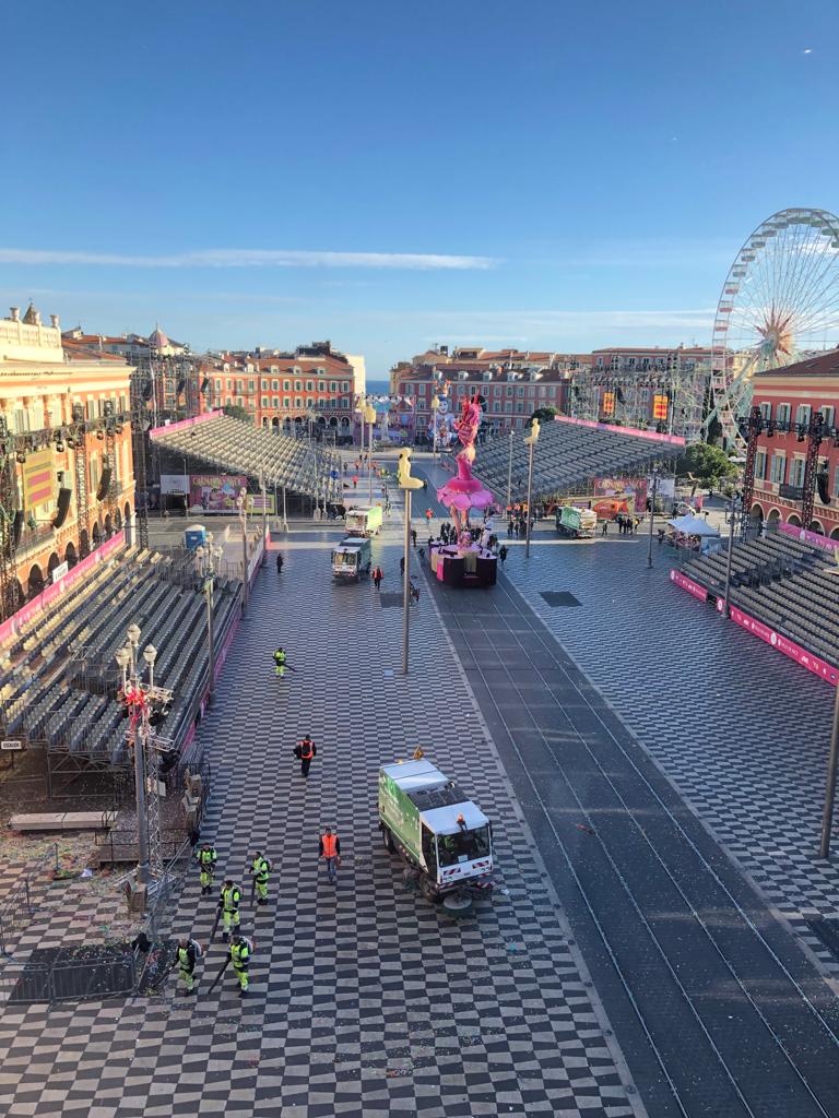 Place Massena, vista dalle Galeries La Fayette, pronta per ricevere il pubblico che assisterà alla sfilata per il Carnevale